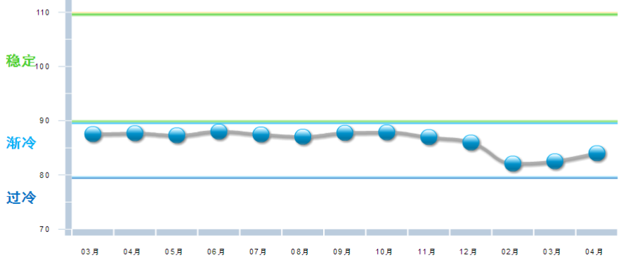 中國輕工業經濟運行及預測預警系統數據顯示:2018年開年,中輕景氣指數延續去年四季度以來的下降態勢,連續3個月在藍色“趨冷”逐月下行,4月中輕景氣指數止跌回升,為88.80,環比3月回升0.98。